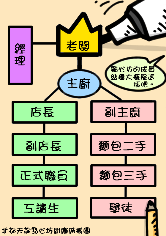 不管是賣什麼,只要是人類的社會,總是會有個組織結構圖,除非你是一人團隊,所有事都自己包辦。我處在的北都天龍點心坊,理所當然的也有一個組織結構圖,基本上可以分成三大類,總公司一個,外場人員一個,然後還有內場人員一個,算是有好好的做組織分工,要說這三個分工系統唯一共通點的話,就是老闆都是最上位者的。接下來,我把組織結構好好的記錄下來,這邊暫時只記組織圖的分工,關於各職位員工的私事和我的嘴砲文字,留著下次再寫。